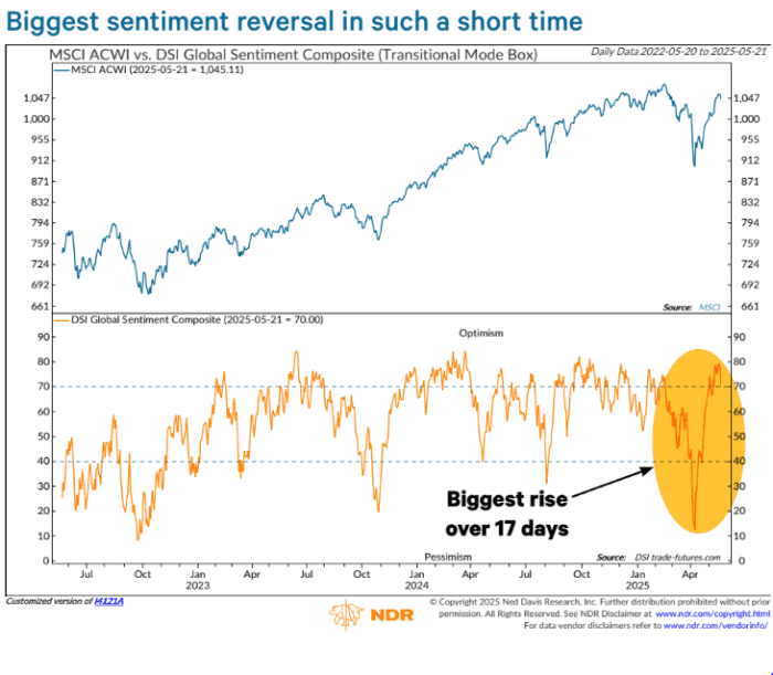 That's according to Tim Hayes, chief global investment strategist at Ned Davis Research, who flagged a chart of the DSI (Daily Sentiment Index) Global Sentiment Index. (A sentiment index numerically represents how optimistic or pessimistic investors feel toward a particular market.) It shows how what he calls a "bipolar market" made the biggest 180-degree swivel from pessimism to optimism in the shortest space of time since the start of data compilation in 2002.