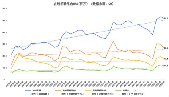 同时,QM数据显示,2022年至今,BOSS直聘MAU规模持续上涨,领先地位与领先优势逐步扩大。