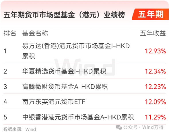 五年期货币市场型基金(港元)业绩榜