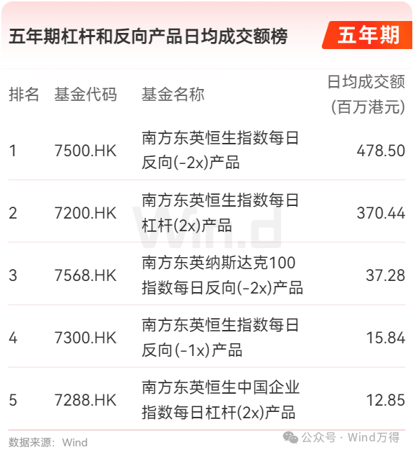 五年期杠杆和反向产品日均规模榜