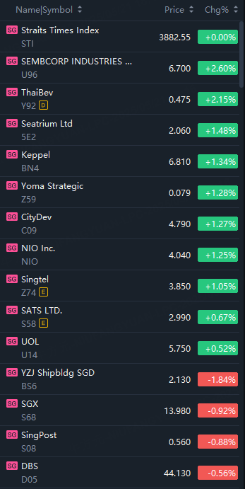 Sembcorp rose 2.6%; Seatrium rose 1.5%; Nio, Keppel, CityDev rose 1.3%; Singtel up 1%; YZJ Shipbldg fell 1.8%; SGX fell 1%.