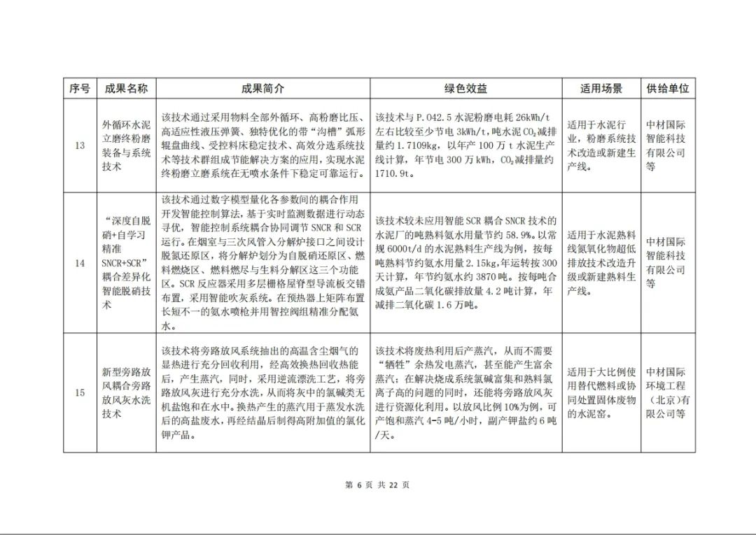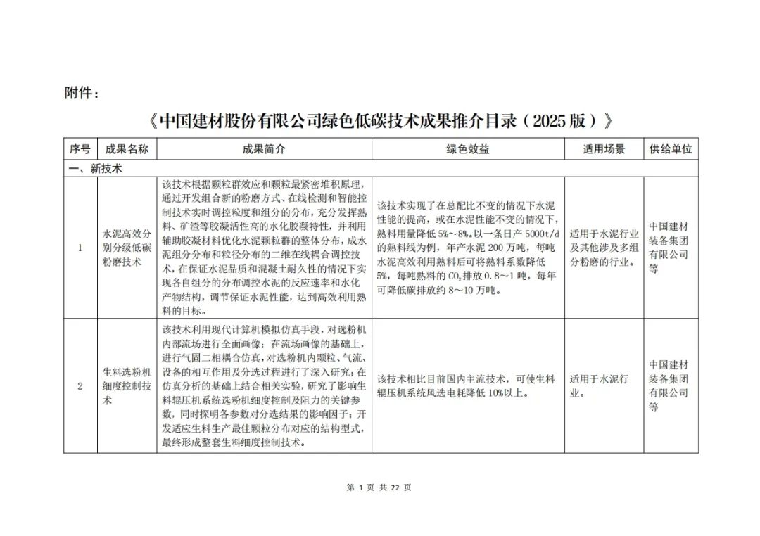 为贯彻落实中国建材集团年度工作会议要求,深入实施公司“1+N”可持续发展战略,助力碳达峰碳中和,提升企业核心竞争力,培育壮大新质生产力,公司组织修订编制了《中国建材股份有限公司绿色低碳技术成果推介目录(2025版)》(以下简称“《目录》”),现正式发布。