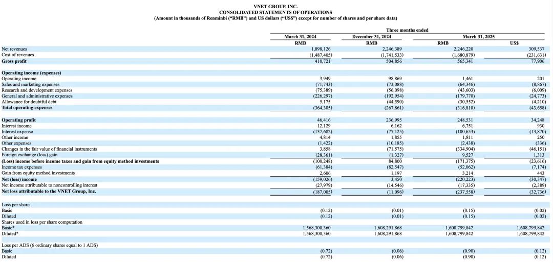 从总净收入来看,2025年第一季度达到22.5亿元人民币(3.095亿美元),较2024年同期的19亿元人民币实现了18.3%的增长。这一同比增长主要归功于批发IDC业务的持续发力。在IDC业务方面,净收入从2024年同期的12.8亿元人民币大幅增长27.8%,至16.4亿元人民币(2.262亿美元),其中批发收入的增长功不可没。批发收入从2024年同期的3.61亿元人民币飙升86.5%,达到6.732亿元人民币(9280万美元);零售收入也有所增长,从2024年同期的9.237亿元人民币增至9.683亿元人民币(1.334亿美元)。