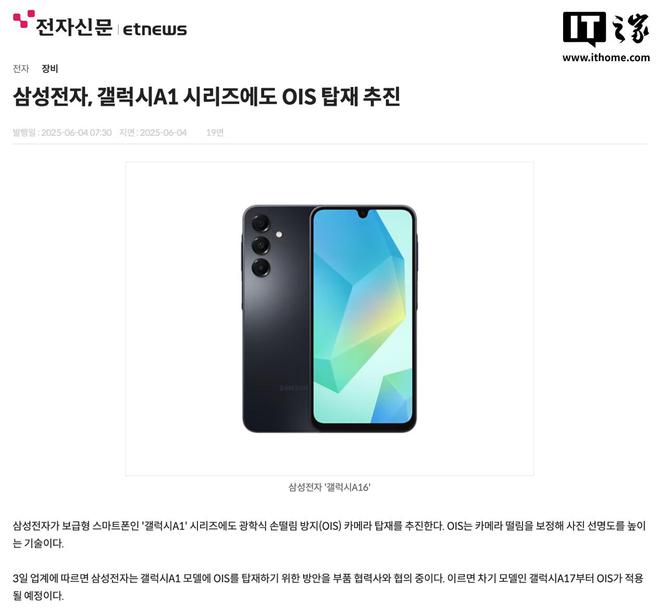 IT之家 6 月 4 日消息,韩媒称三星将下放光学防抖(OIS)技术至 Galaxy A17 手机,使其成为 Galaxy A1x 系列首款搭载该技术的机型。