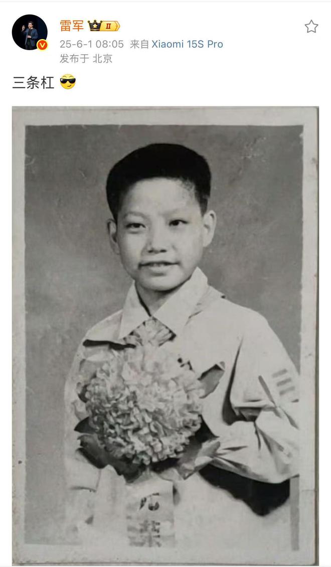 6月1日儿童节当天,雷军晒出童年照片,并配文“三条杠”。值得注意的是,雷军好朋友凡客陈年也晒了一波童年照。