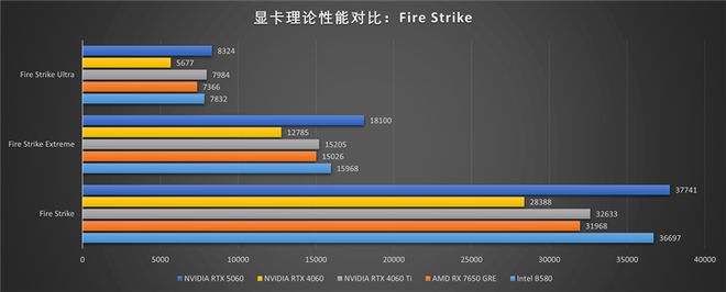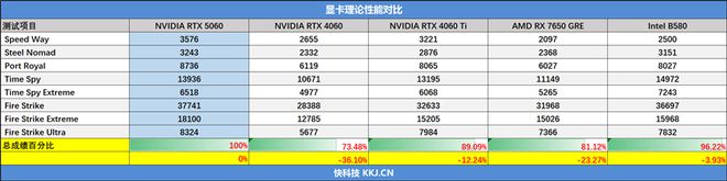 索泰RTX 5060 XGAMING OC显卡在3Dmark测试软件中,成绩对上代RTX 4060和RTX 4060 Ti都有所提高,实现跨级提升,并且对同档的AMD和Intel显卡都有领先,极有可能是利用后发优势,特意调整了性能以实现领先。