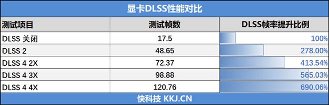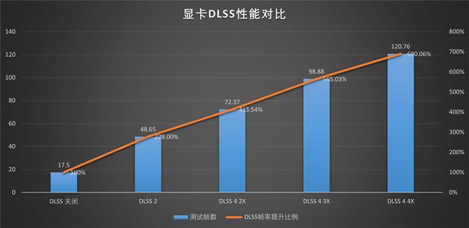 在3Dmark NVIDIA DLSS功能测试中,关闭DLSS 4时帧数为17.5FPS左右,开启DLSS 4 2x之后帧数上升为72.37FPS,开启DLSS 4 3x之后帧数上升为98.88FPS,开启DLSS 4 4x之后帧数上升为120.76FPS。