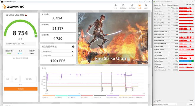 在3DMark的Fire Strike Ultra(DX11+4K渲染分辨率)测试中,总成绩为8754,其中显卡分数为8324。