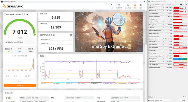 在3DMark的Time Spy Extreme(DX12+4K渲染分辨率)测试中,总成绩为7012,其中显卡分数为6518。