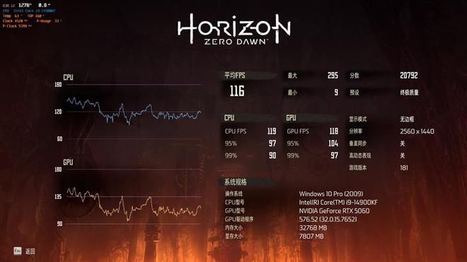 在《地平线:零之曙光》中,使用终极质量画质进行测试,2K分辨率下平均帧率为116,1080P分辨率下平均帧率为146。