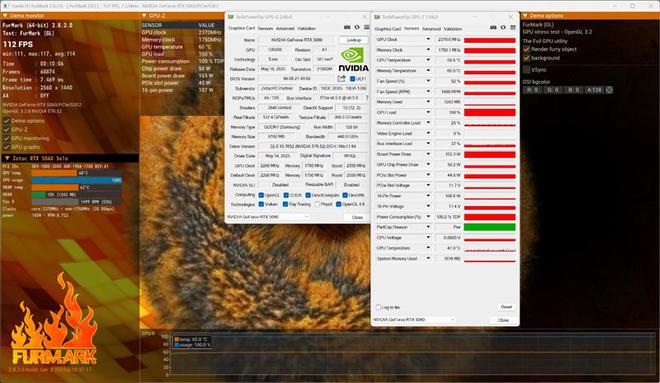 我们使用Furmark对索泰RTX 5060 XGAMING OC显卡进行10分钟的烤机,室温约29度,整卡功耗稳定在155W,核心频率2370MHz,温度59.6度,风扇转速1500RPM。