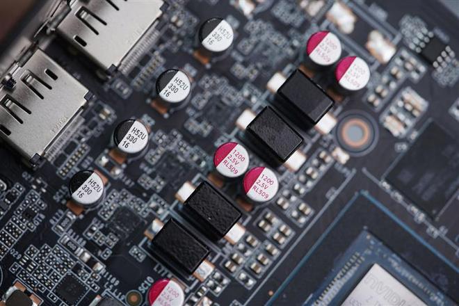 索泰RTX 5060 XGAMING OC显卡的S.E.P 3.0供电系统特写,4+2相供电配合大量固态电容滤波,供电更加纯净。