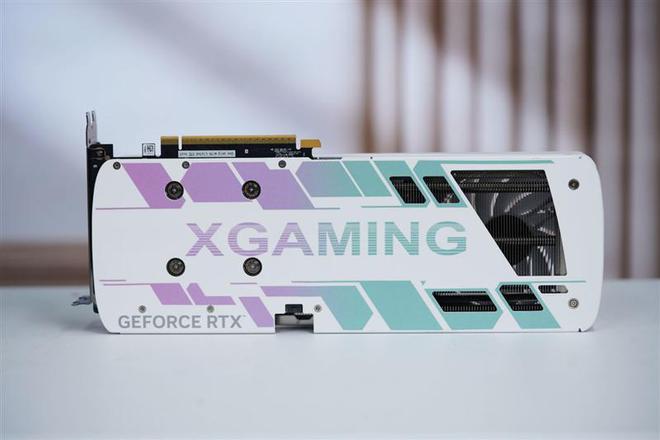 索泰RTX 5060 XGAMING OC显卡的金属背板同样是印有青紫色渐变的图案和巨大的"XGAMING"字样,尾部设计有几何形的散热镂空,方便尾部风扇的气流直接吹透显卡。