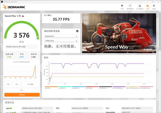 在3DMark测试综合性能的Speed Way测试中,总成绩为3576,其中显卡测试成绩为35.77FPS。
