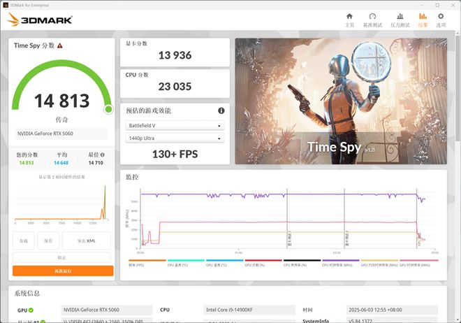 在3DMark的Time Spy(DX12+2K渲染分辨率)测试中,总成绩为14813,其中显卡分数为13936。