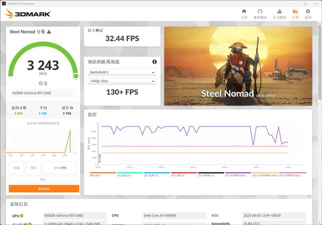 在3Dmark中测试可靠性、稳定性和持续性能的Steel Nomad测试中,总成绩为3243,其中显卡测试成绩为32.44FPS。