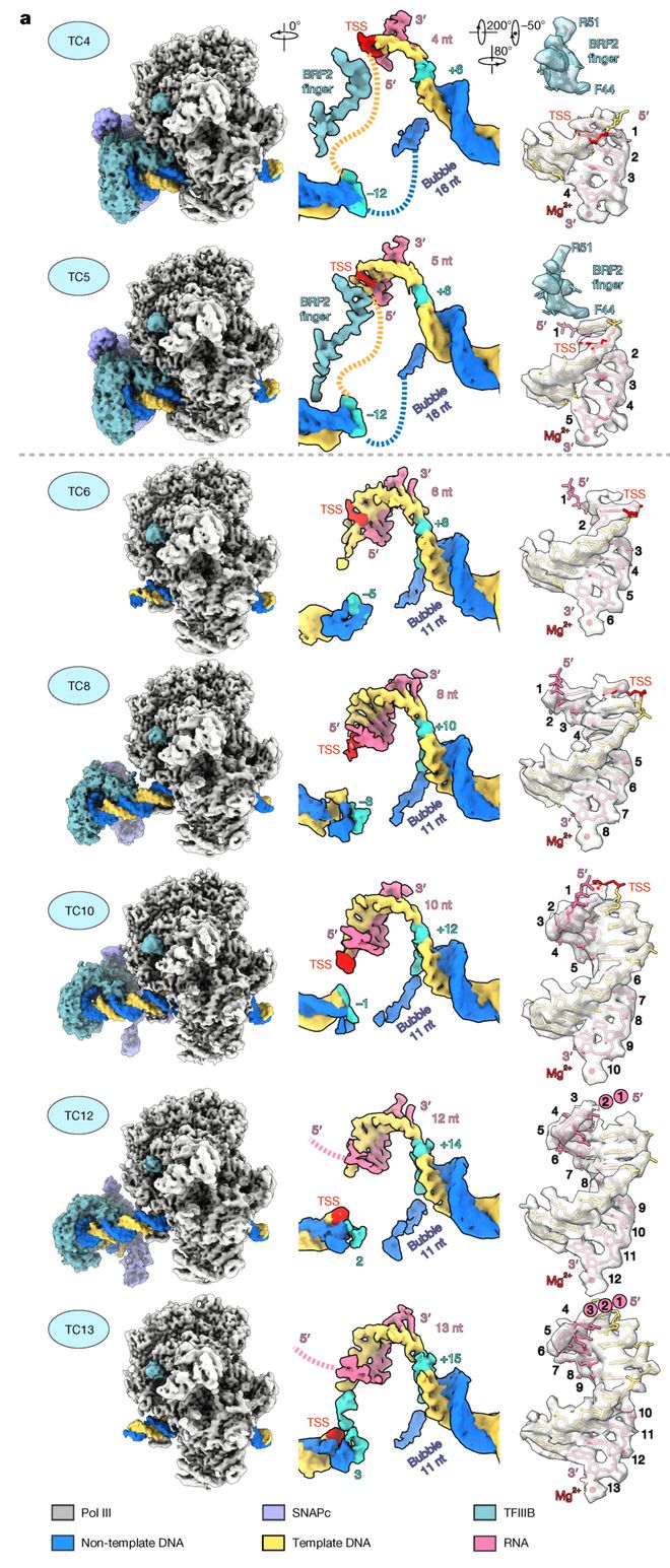 ▲ Pol III 转录起始动态过程:七个 Pol III-TC 结构示意图RNA 聚合酶(RNAPs)是转录的核心酶,负责将 DNA 上的遗传信息转录为 RNA。在哺乳动物中,RNA 聚合酶进化出三种功能分化的形式:Pol I、Pol II 和 Pol III。其中,Pol II 负责转录编码蛋白质的 mRNA,由于其与基因表达调控密切相关,长期以来一直是转录研究的重点对象。相比之下,Pol III 主要转录多种短链非编码 RNA(如 5S rRNA、tRNA 和 U6 snRNA 等),在蛋白质合成、RNA 剪接以及细胞周期调控中发挥关键作用。