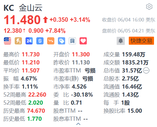 美股异动丨金山云盘前涨超7% 获富瑞大幅上调目标价