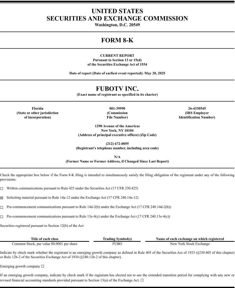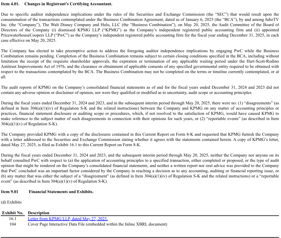 由于Fubo与Hulu+Live TV拟议业务合并完成后可能触犯SEC有关审计独立性的监管规定,审计委员会决定:(1)自生效日起终止与毕马威的合作;(2)聘任普华永道担任截至2025年12月31日财年的独立审计机构。毕马威此前负责该公司截至2024年12月31日财年的审计工作。