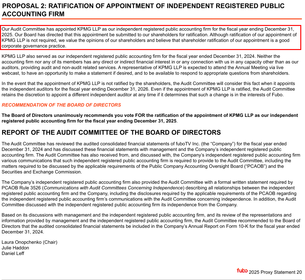 2025年5月27日,FuboTV公司股东提交美国证券交易委员会委托书补充说明显示,根据此前披露,该公司审计委员会于2025年5月20日决议:(1)聘请普华永道会计师事务所担任截至2025年12月31日财年的独立注册会计师事务所;(2)终止毕马威会计师事务所的审计服务,两项决议均自2025年5月20日起生效。鉴于审计机构变更发生在原委托书提交之后,现对《提案二:批准独立注册会计师事务所聘任》章节更新如下: