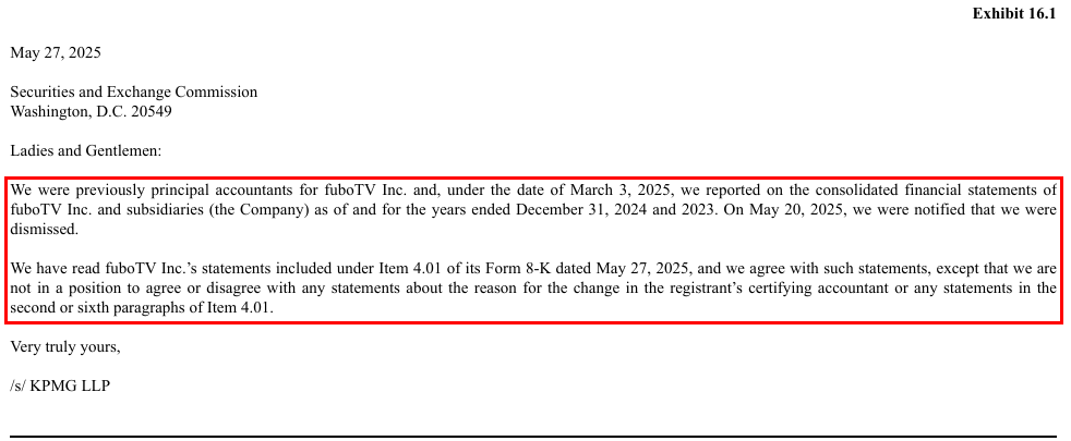 毕马威已阅读fubo TV Inc.于2025年5月27日提交的8-K表格中第4.01项所载声明。除无法对注册人变更核证会计师的原因说明,以及无法对第4.01项第二段和第六段中的陈述表示同意或反对外,同意其他声明内容。
