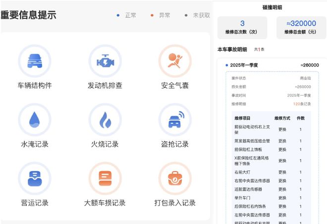不过,根据该平台展示的另一份车辆历史信息报告,该车此前共有3次维修出险记录,总维修金额高达32万元。存在气囊弹出等7处维修部位异常,以及大额车损、打包录入记录。“打包录入”一般指,车辆发生严重事故后,保险公司因定损理赔项目繁杂或修复成本过高,将车辆维修明细统一记录而非逐项列明的操作方式。