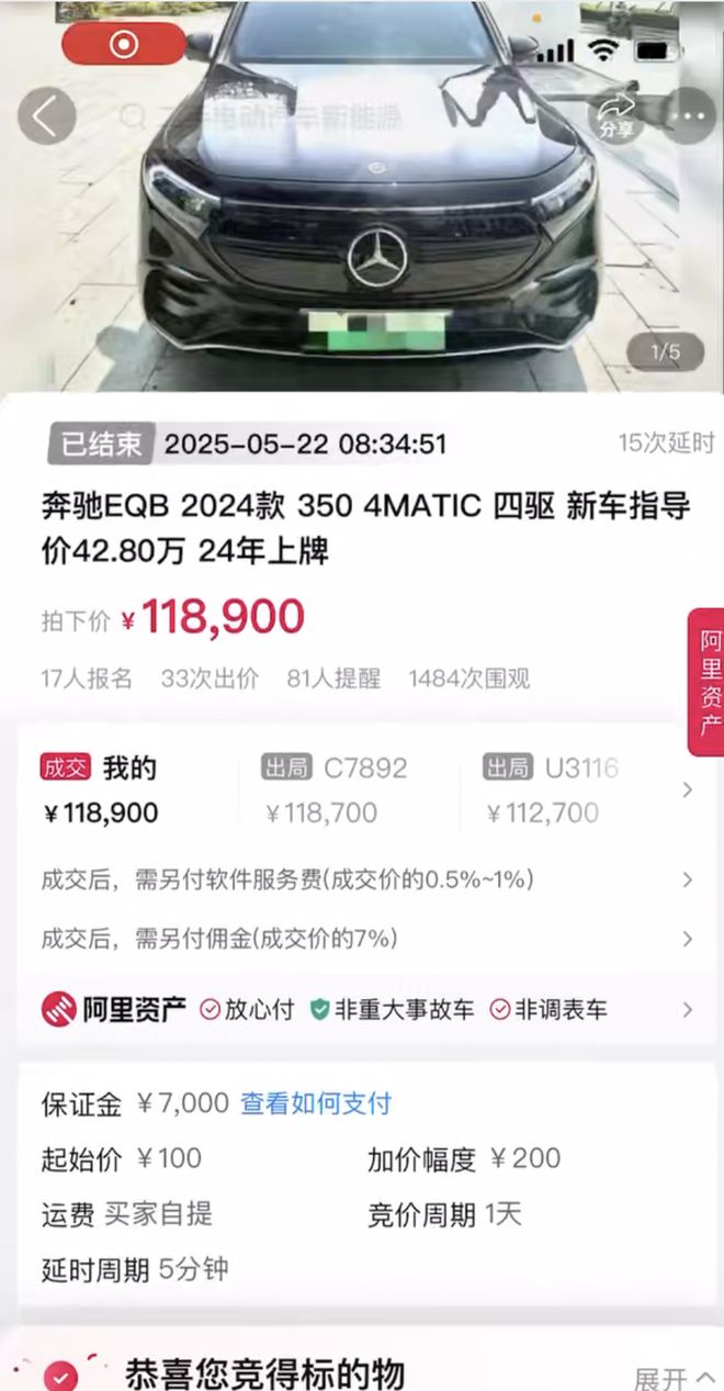訾先生介绍,2025年5月22日,他在“阿里拍卖”平台以118900元的价格,拍得一辆2024年1月出厂的奔驰2024改款EQB350 4MATIC汽车。