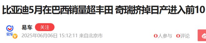 电动知家消息,6月6日,据多家媒体报道,比亚迪在2025年5月的巴西轻型车零售市场上取得了重大突破,首次超越丰田,成为当月销量排名第四的汽车品牌。