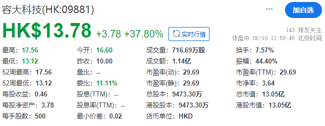 截至午间收市,容大科技每股报13.78港元,总市值约13.05亿港元。