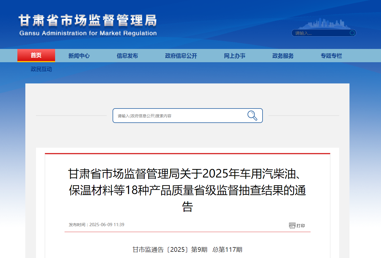 近期,甘肃省市场监督管理局对车用汽柴油、保温材料等18种产品组织开展了产品质量省级监督抽查。现将有关抽查情况通告如下: