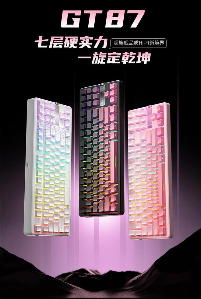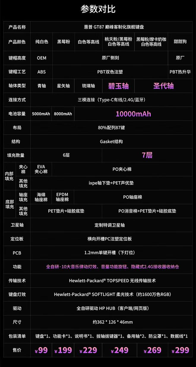 惠普 GT87 键盘采用 87 键 80% 配列和 Gasket 垫片固定结构,包含 6 种不同定价的 10 个具体版本,内置 6~7 层填充。其采用按键下灯位设计,支持十大 RGB 音乐律动灯效,可通过网页驱动自定义。