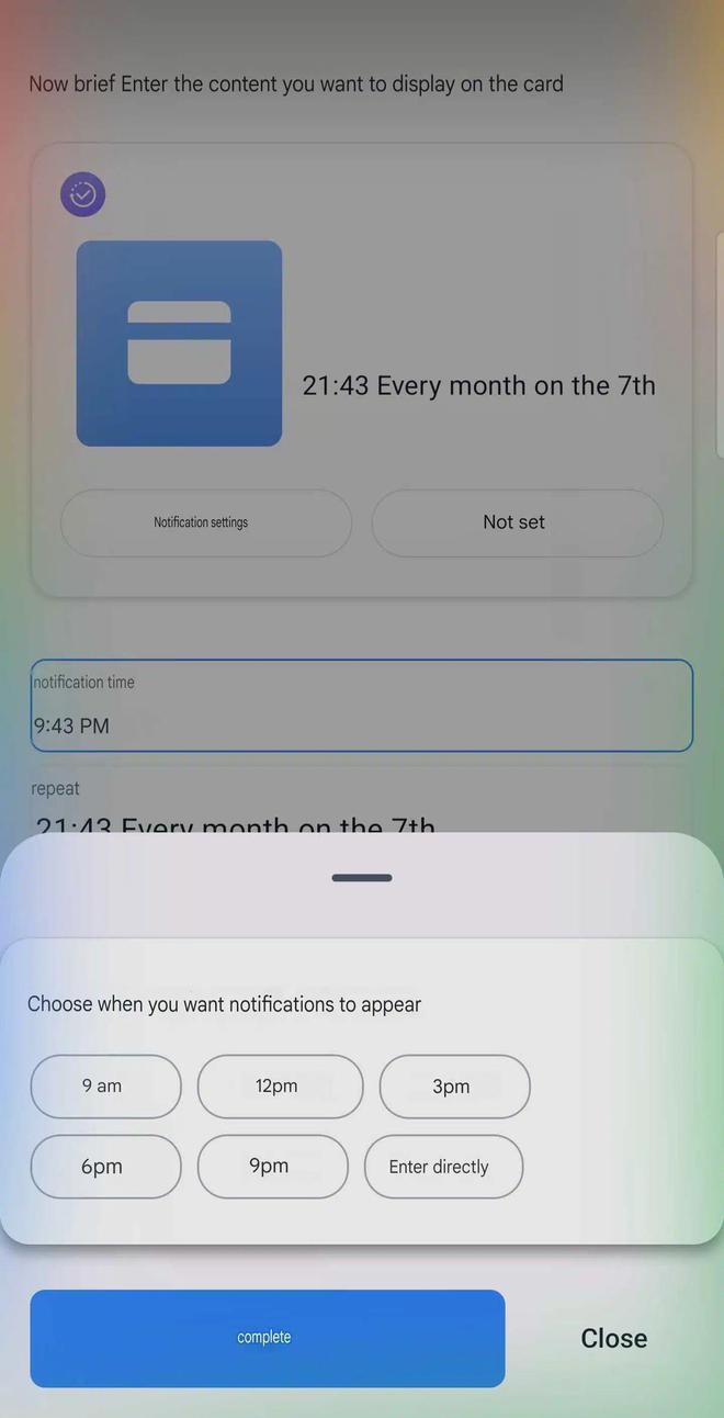 这些卡片支持自定义显示时间、触发动作以及图标和标题等内容,该功能目前仅以韩语显示,且尚未正式启用,表明仍在开发中。