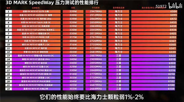 在其最新发布的22款RX 9070 XT显卡横评测试视频中,结果也证实了这一点,在3D Mark SpeedWay压力测试中,所有排名靠后的显卡,均为三星显存颗粒。