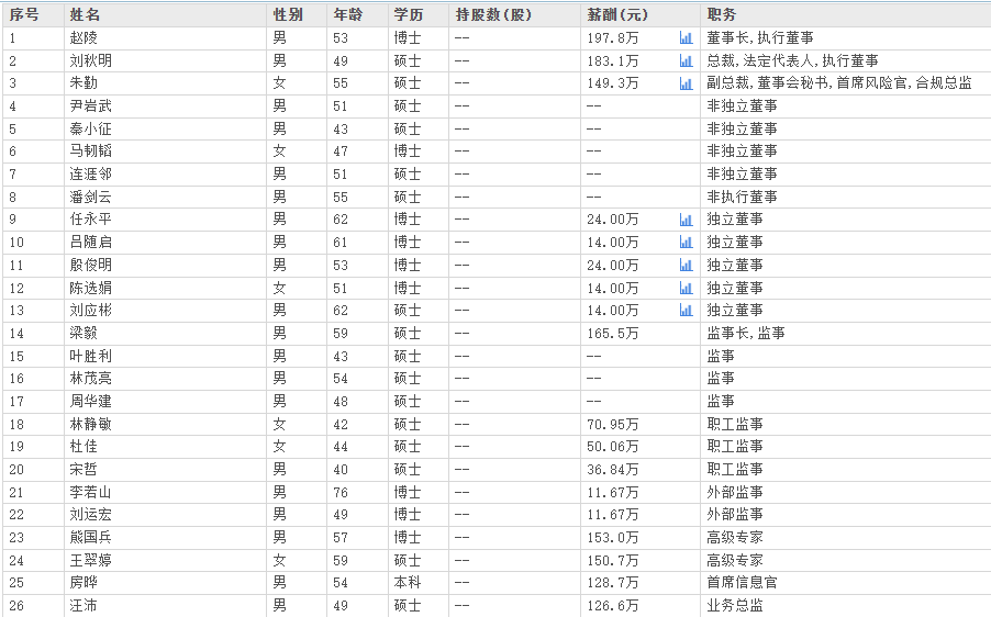 2024年,梅键的薪酬为153.25万元,仅次于董事长赵陵和总裁刘秋明。熊国兵、王翠婷两名高级专家,薪酬均超过150万元。身兼副总裁、合规总监、首席风险官、董秘的朱勤女士,薪酬149.29万元。首席信息官房晔和业务总监汪沛,薪酬分别为128.71和126.60万元。
