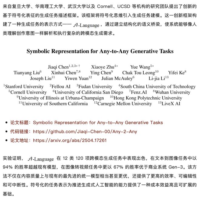 该研究提出的符号化生成任务描述语言及配套推理引擎,为多模态任务提供了一种无需专门训练的全新高效解决方案。通过利用预训练大语言模型将自然语言指令直接转化为符号化工作流,该方法成功实现了 12 类跨模态生成任务的灵活合成。实验证明,该框架不仅在生成内容质量上媲美现有的先进统一模型,更在效率、可编辑性和可中断性等方面展现出显著优势。符号化任务表示方法或许能为提升生成式 AI 能力提供一条经济高效且可扩展的技术路径。