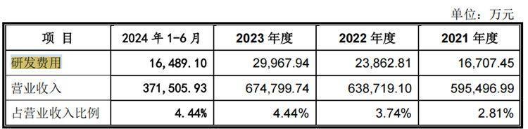 招股书显示,报告期内,嘉立创的研发费用分别为1.67亿元、2.39亿元、3.00亿元和1.65亿元,占当期营业收入的比例分别为2.81%、3.74%、4.44%和4.44%。