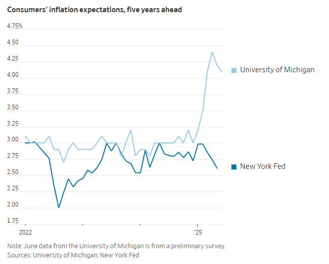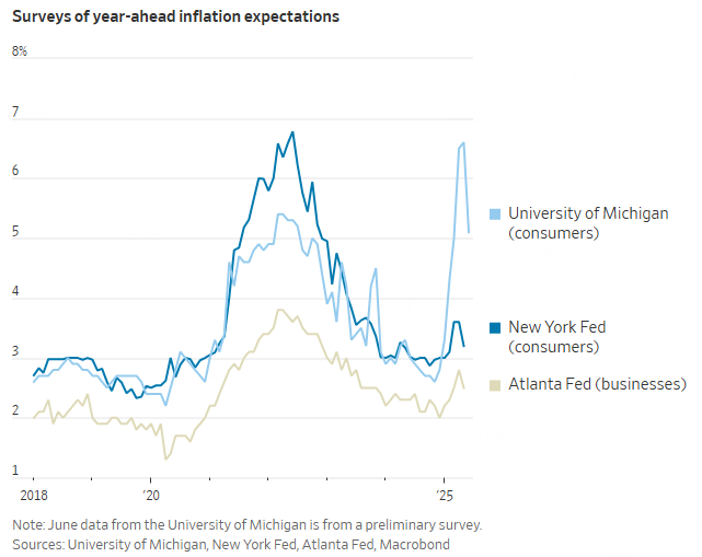 The recent outlook on expectations is murky. One widely watched measure -- a monthly survey by the University of Michigan -- showed an unusual jump this spring in both short- and long-term inflation expectations, though it partially reversed after some of the larger tariff hikes were suspended. A separate New York Fed consumer survey has shown only a mild increase.