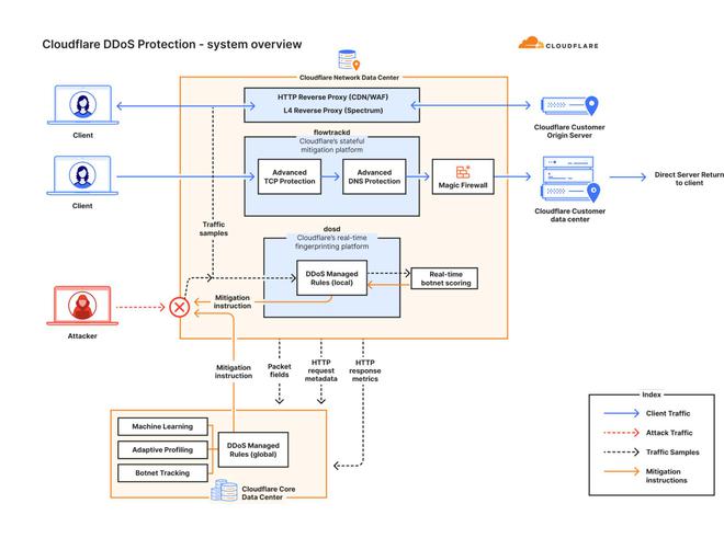 Cloudflare 依托分布式 anycast 网络,将攻击流量分散至全球 477 个数据中心。其核心系统“dosd”通过实时指纹识别技术,在 Linux 内核层分析数据包,运用 eBPF 程序生成精准拦截规则。