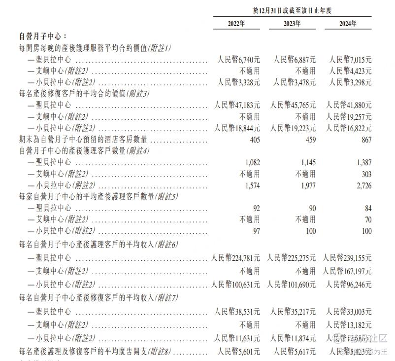 从经营数据上看,圣贝拉主品牌每家自营月子中心的平均产后护理客户数量从2023年的90名下降到2024年的84名;次高端品牌小贝拉,每家自营月子中心的平均产后护理客户的平均收入从2023年的10.2万下降到2024年的9.6万,明显受到经济周期的影响: