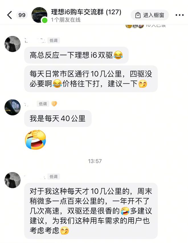 有趣的是,社交平台上已经传出理想 i6 的购车交流群,部分群友表示他们的日常通勤不算长,平常也不需要跑高速,更希望出一款更偏向续航的两驱版理想 i6。