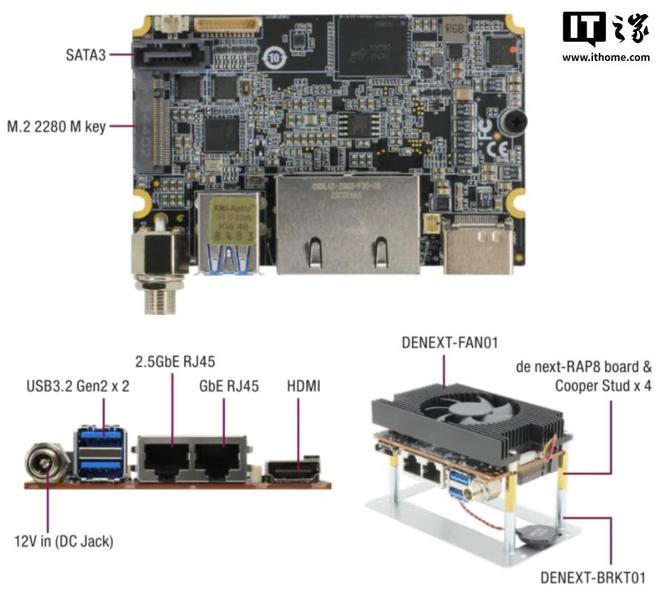 由于性能提升,de next-RAP8 采用了主动散热方案 —— DENEXT-FAN01 风扇散热解决方案,该方案配备一个覆盖整个电路板底面的大型散热片,并与冷却风扇集成。