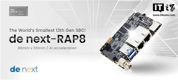IT之家 6 月 23 日消息,研扬科技(AAEON)上周发布了新款单板计算机“de next-RAP8”,宣称是世界上最小巧的搭载嵌入式 13 代酷睿处理器的主板,尺寸为 86 x 55mm,和一张身份证、银行卡差不多。