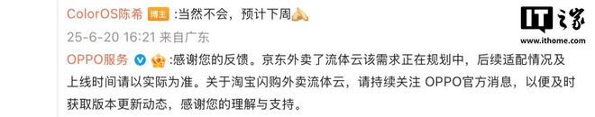 IT之家 6 月 22 日消息,OPPO ColorOS 设计总监陈希在微博上透露百度地图 App 驾车导航已接入ColorOS流体云,评论区有用户询问“京东外卖和淘宝闪购何时适配”,对此陈希回应称“预计下周(即 6 月 23 日至 6 月 29 日)适配(京东外卖)”。另综合“OPPO 服务”微博回应内容,预计淘宝闪购适配流体云还要等待一段时间。