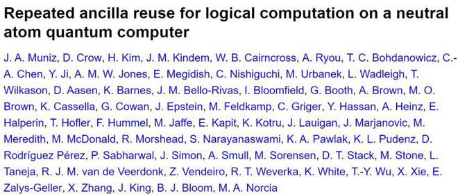 此外,该团队还验证了另一项新技术:在量子比特原子丢失时实现原子替换。在特定量子计算系统中,量子比特的制备需通过激光镊子俘获中性原子并将其固定在晶格位点。而在运算过程中,这些原子可能发生逃逸或位点丢失现象,而该团队首次实现了运算周期内的原子替换,通过原子束将新原子注入阵列,且全程不影响计算进程。值得注意的是,这篇论文的作者达到几十位之多。