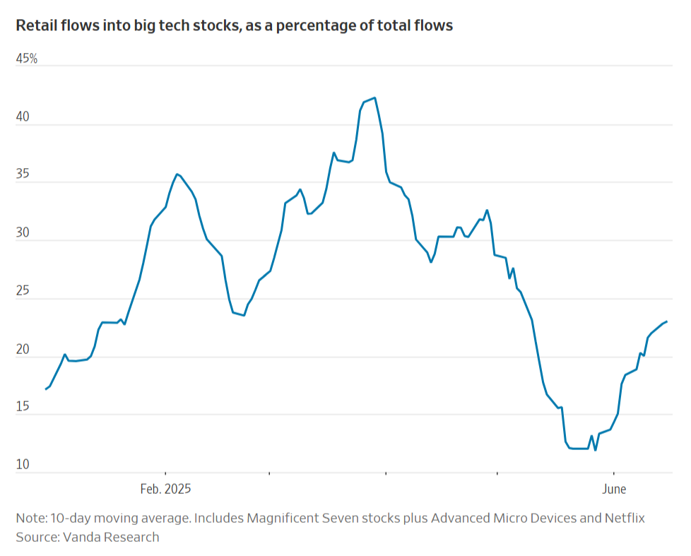 Individual investors have cut back on purchases of the Magnificent Seven and other tech giants in recent weeks, according to Vanda Research. Retail buying has fallen as a percentage of total inflows to about 23% in mid-June from about 41% at the start of April’s market turmoil.