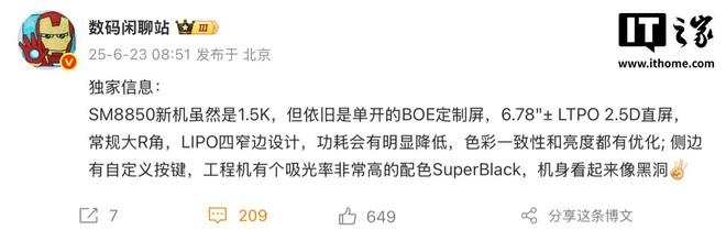 IT之家 6 月 23 日消息,博主@数码闲聊站发文,透露一款 SM8850 神秘新机将搭载一块 6.78英寸 1.5K BOE 定制LTPO 2.5D直屏,采用常规大 R 角、LIPO 四窄边设计,功耗将明显降低,色彩一致性和亮度都有优化,同时手机侧边配备自定义按键,目前工程机存在一款吸光率非常高的配色 SuperBlack,号称“机身看起来像黑洞”。