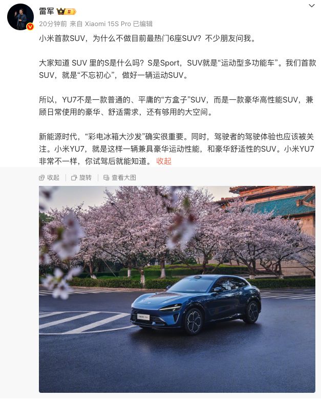6月23日,小米董事长兼CEO雷军在微博发文,回应为何不做6座SUV。雷军表示,“大家知道SUV里的S是什么吗?S是Sport,SUV就是‘运动型多功能车’。我们首款SUV,就是‘不忘初心’,做好一辆运动SUV。”“新能源时代,‘彩电冰箱大沙发’确实很重要。同时,驾驶者的驾驶体验也应该被关注。小米YU7,就是这样一辆兼具豪华运动性能,和豪华舒适性的SUV。”他写道。