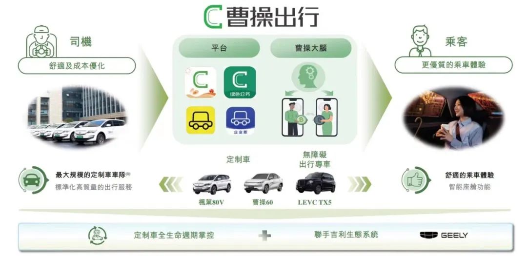招股书显示,曹操出行深度参与车辆设计过程,能够设计满足乘客及司机需求的车辆,包括提高车辆的耐用性、可维修性,采用创新的换电架构及设置智能座舱功能。其参与范围涵盖车辆设计、部署,定价、销售到营运及服务的整个生命周期,能够优化乘客体验、降低车辆TCO(全生命周期成本)等。