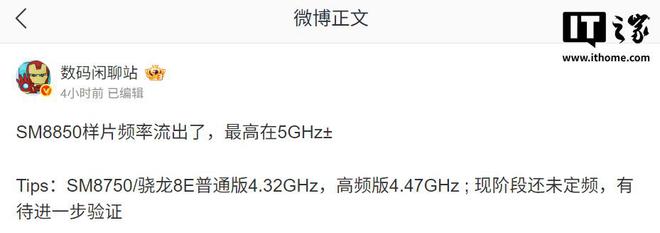 该博主还表示,SM8750 / 骁龙 8 至尊版普通版的频率为 4.32GHz,高频版为 4.47GHz;(SM8850)现阶段还未定频,有待进一步验证。