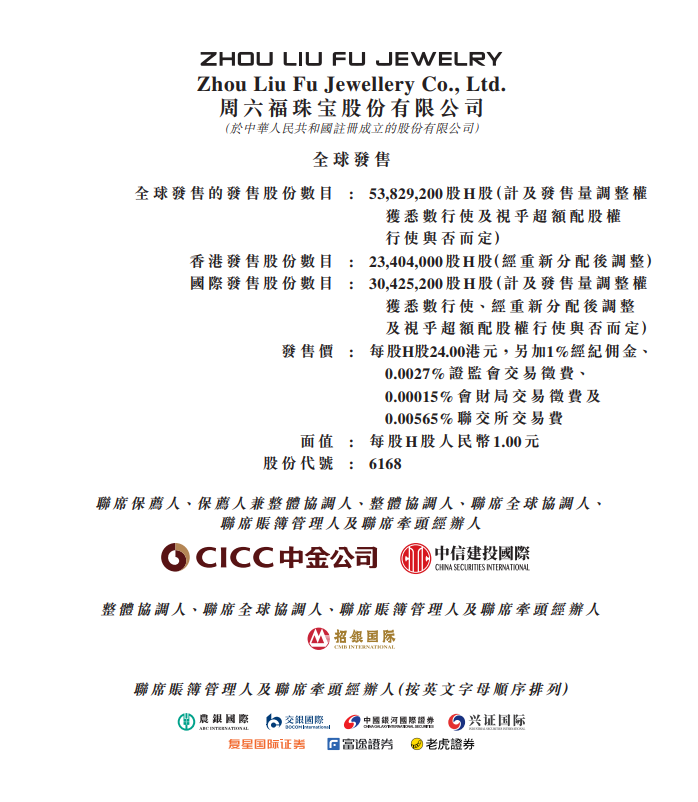 周六福此次全球发售的H股股份总数为53829200股,其中香港发售股份数目为23404000股H股,国际发售股份数目为30425200股H股。发售价定为每股H股24.00港元,面值为每股人民币1.00元。